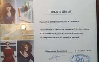 Эксперт окрашивания. Приняла активное участие в семинаре: Коллекция техник окрашивания Color Sensation; Творческий импульс в салонной практике; Совершенствование знаний и умений
