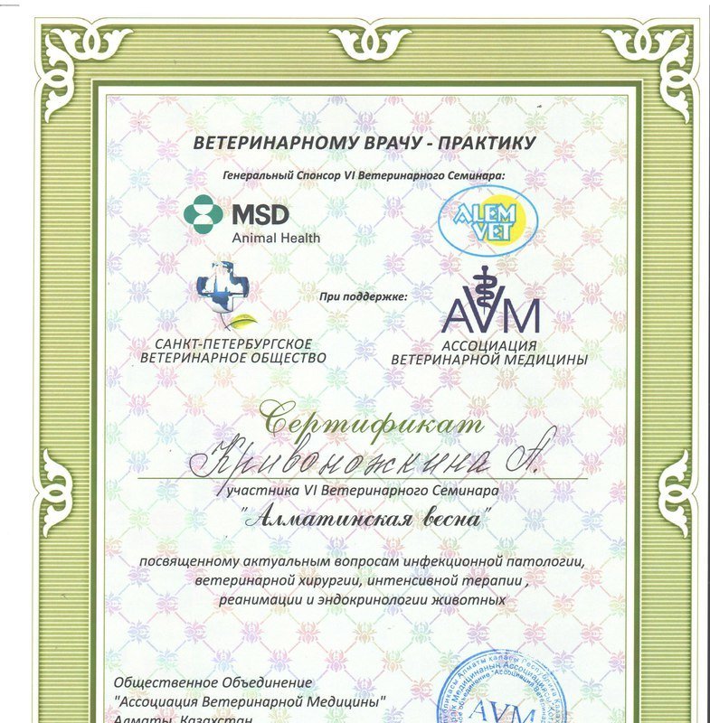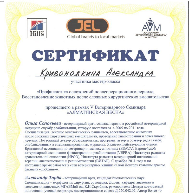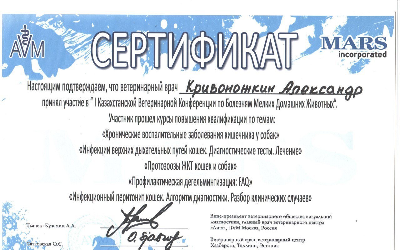 Кривоножкин Александр Васильевич, главный ветеринарный врач клиники. Закончил Казахский Национальный Аграрный Университет. Стаж работы с 2006 года. Специализируется в области хирургии, стоматологии, неврологии, ортопедии. В 2015 году успешно прошел стажировку у ведущих ветеринарных специалистов Москвы в области стоматологии мелких домашних животных. Ежегодно посещает лекции и мастер классы для повышения квалификации.