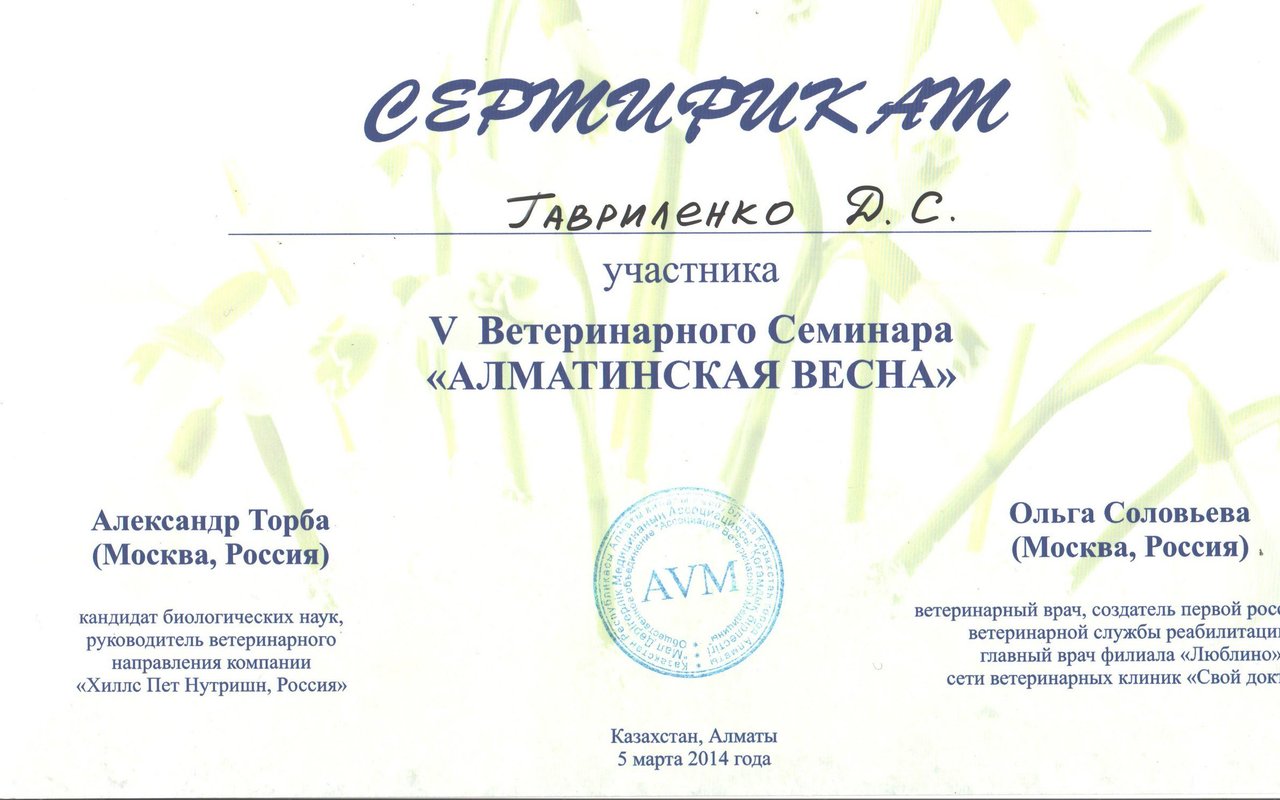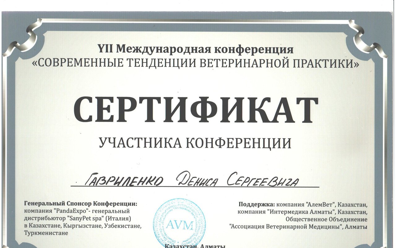 Гавриленко Денис Сергеевич, директор ветеринарной клиники Dog Premium. Закончил Казахский Национальный Аграрный Университет. Специализируется в области терапии, диетологии, пластической хирургии, орнитологии. Общий стаж работы с 2002 года. Активно принимает участие в мастер классах с участием зарубежных коллег.