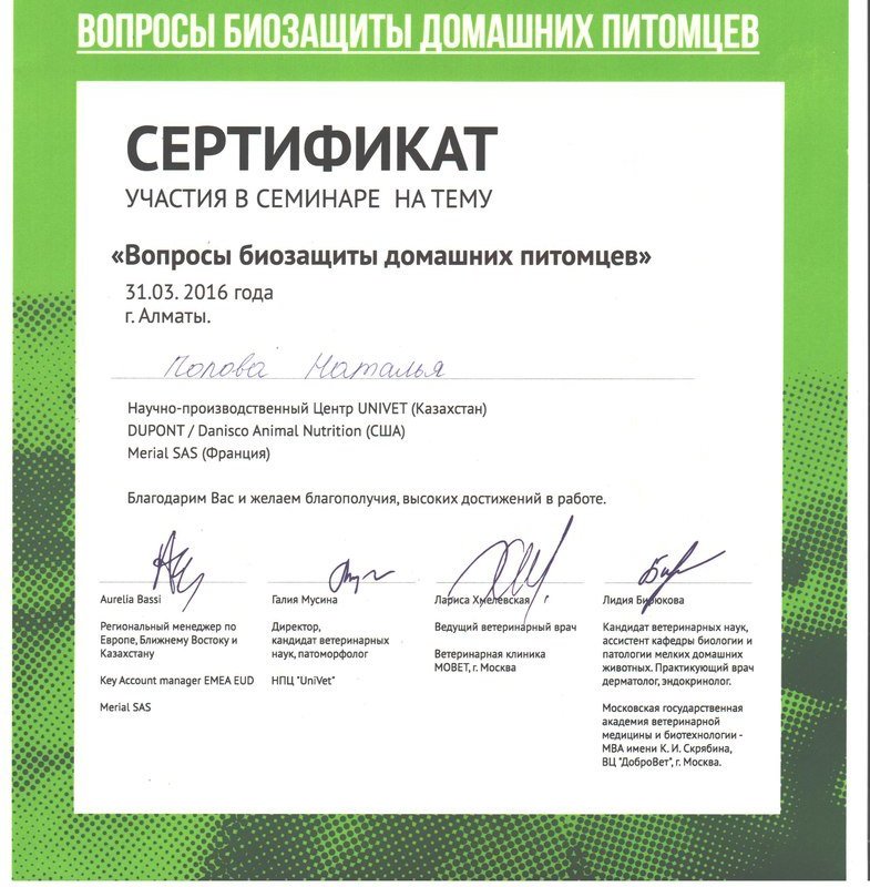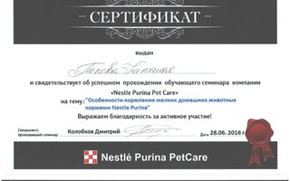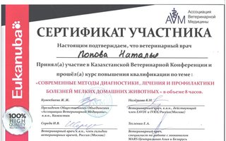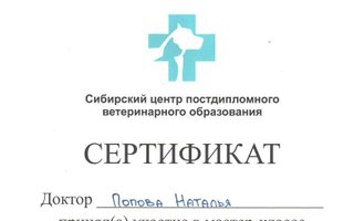 Попова Наталья Сергеевна, врач общей практики. Специализируется в области терапии, дерматологии, эндокринологии и визуальной диагностики. В 2015 году прошла стажировку по ультразвуковой диагностике в одной из ведущих клиник России - "Бэст". Является активным участником конференций и мастер классов для повышения квалификации ветеринарных врачей.... Показать еще