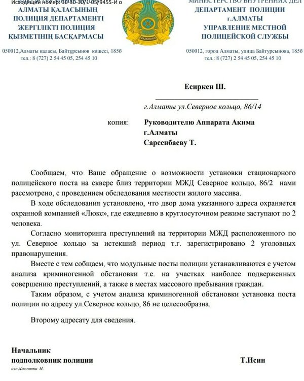 Ответ относительно установки мобильного пункта полиции возле МЖД Северное кольцо.