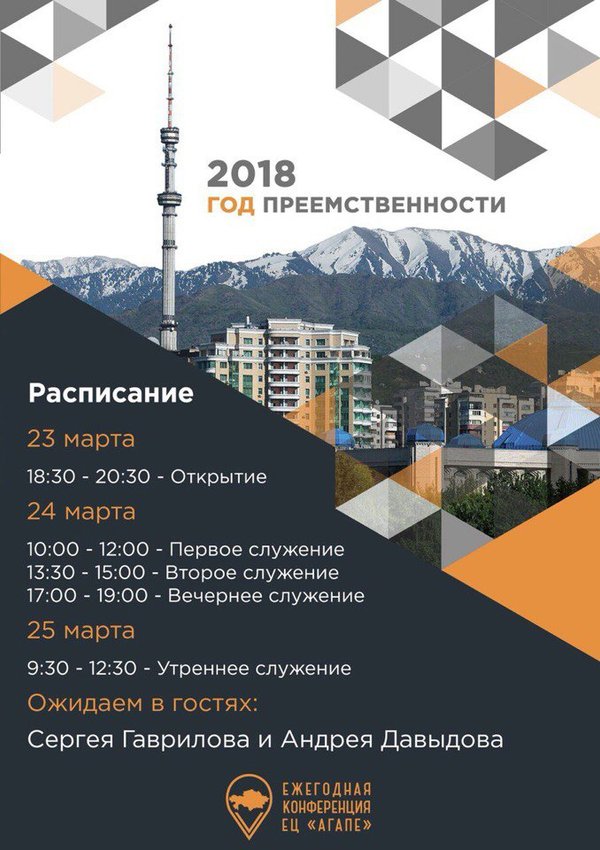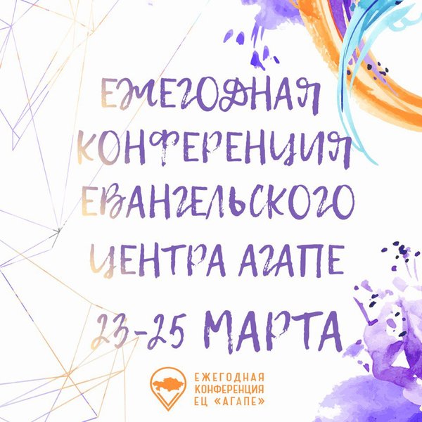 Главное событие Евангельского Центра Агапе! Всеобщая ежегодная конференция, на которую съезжаются церкви со всего Казахстана. Даты проведения и расписание уже известны. Ожидаем Вас! __________ 23—25 марта #