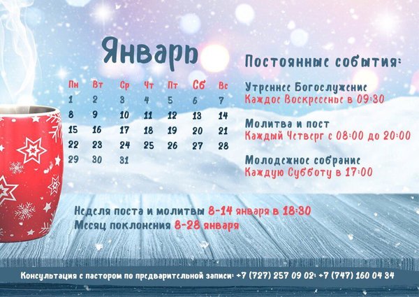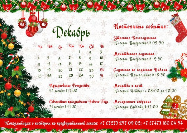 Добрый утро, дорогие подписчики! Календарь событий на этот месяц Декабрь обещает быть насыщенном! Заранее планируйте своё расписание и постарайтесь присутствовать на всех мероприятиях нашей любимой церкви -