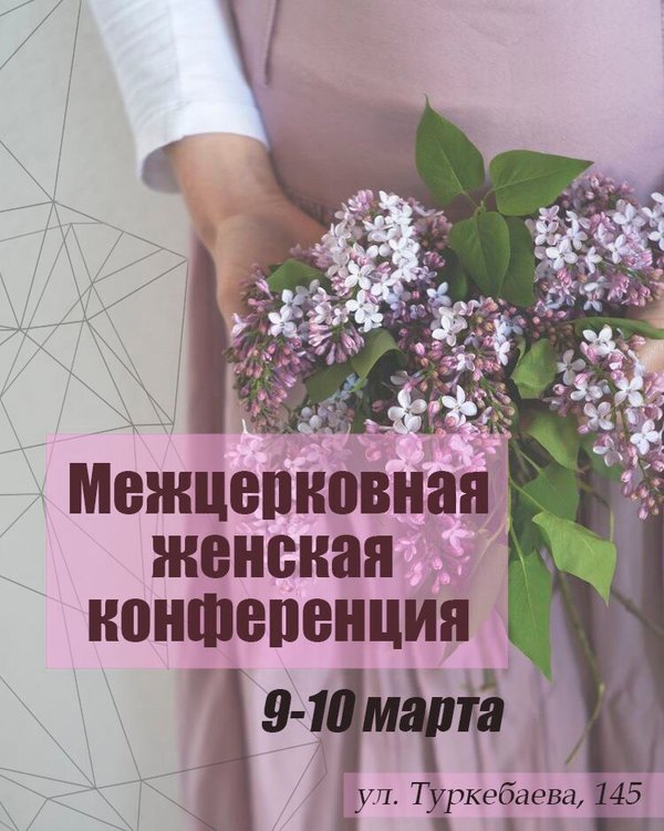 Дорогие девушки! Совсем скоро весна, и мы с радостью хотим пригласить вас на Межцерковную Женскую Конференцию Преображение. Вдохновляем не пропустить это важное событие в жизни каждой из вас! Верим, что Бог в это время будет по-особенному выражать свою любовь к вам Помните, что ваша внутренняя красота-залог правильного основания! - ..потому что мудрость лучше жемчуга, и ничто из желаемого не сравнится с нею. Притчи Соломона 8:11 - 9—10 марта Туркебаева, 145