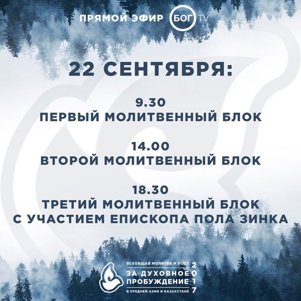 Дорогие друзья, до второго дня Молитвы за пробуждение в Средней Азии осталось несколько часов. Мы вдохновляем Вас быть участниками этого исторического события. - На эту Молитву из разных уголков мира прилетели для того, чтобы служить, такие спикеры, как: • Пол и Шерон Зинк • Сергей Шидловский • Александр Чувиров - Друзья, будьте с нами в прямом эфире на Бог ТВ. - 21—23 September Almaty, Agape church #️⃣