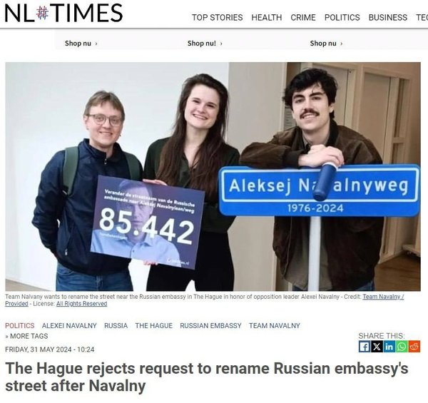 ️Власти Гааги отказались переименовывать улицу у российского посольства в честь Алексея Навального Муниципалитет отметил, что переименование возможно только в исключительных случаях и в честь людей, умерших не менее десяти лет назад. Ну хоть у голландцев больше гордости и здравого смысла, в отличие от французов с их переименованием улицы рядом с российским посольством