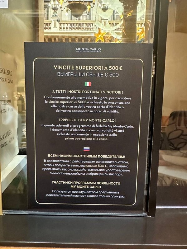 Россияне не смогут забрать выигрыш в казино Монако Власти Монако ввели ограничения для граждан России, не имеющих двойного гражданства или вида на жительство в странах ЕС. Теперь если россиянин выиграет в казино Монако более 500 евро, он не сможет забрать свой приз. Ограничение на вывоз выигрышей распространяется только на граждан России без двойного гражданства или ВНЖ в ЕС. Для остальных игроков правила остаются прежними. Ну теперь уж точно «Зачем мне солнце, Монако?..»