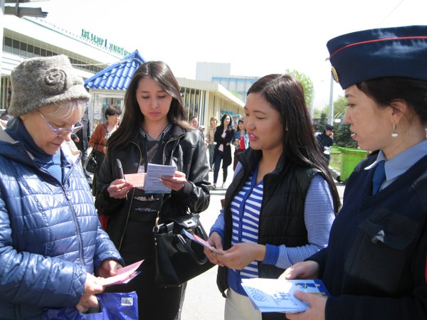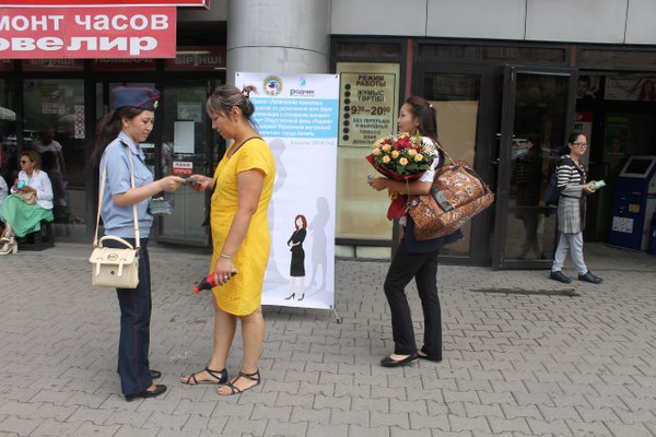 и гостей города, также были распространены памятки с номерами телефонов, куда можно обратиться за консультацией и помощью. В акции активное участие приняли наши партнеры Местная полицейская служба ДВД города Алматы: участковые инспекторы и инспекторы по защите женщин от насилия – Сламджанова Л. (Медеуский район) и Ахметова М. (Наурызбайский район).