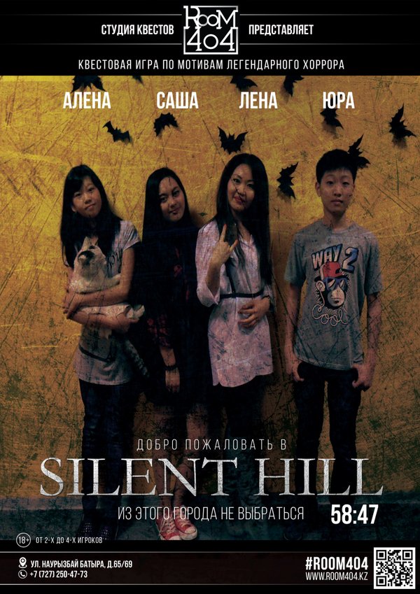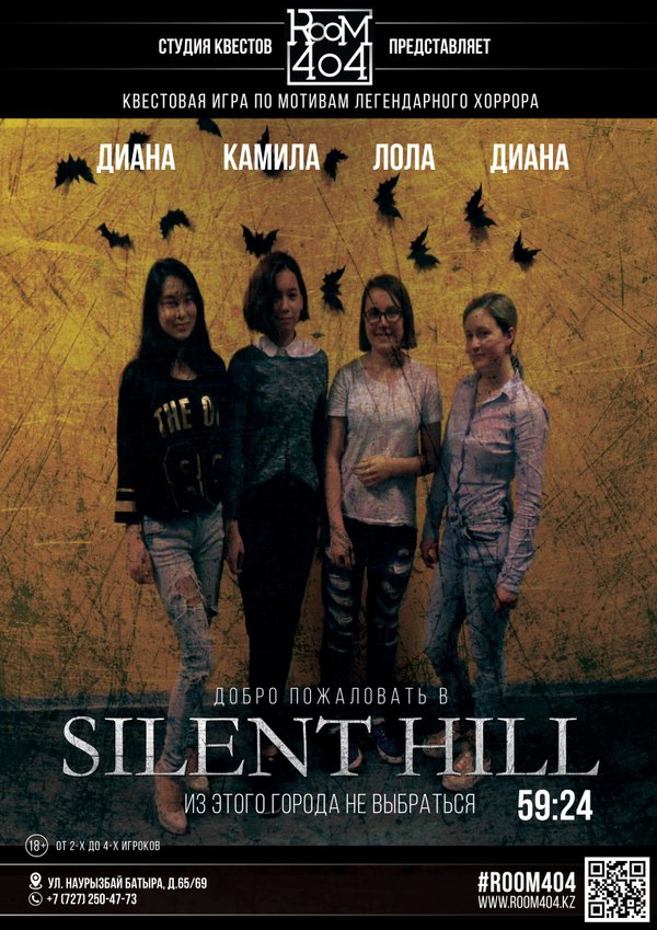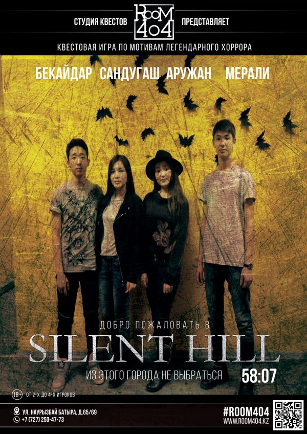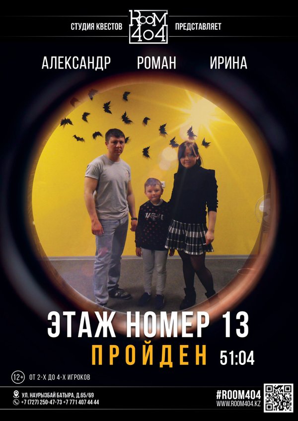 Что бы зарезервировать квест, нужно позвонить по телефонам: или Стоимость одной игры с одной команды: SILENT HILL или ЭТАЖ НОМЕР 13 Будние дни до 18:00 — 9000. После 18:00 — 12000. Выходные дни до 14:00 — 12000. После 13:00 — 14 000. ПОГРЕБЕННЫЕ ЗАЖИВО Будние дни до 18:00 — 6000. После 18:00 — 7500. Выходные дни до 14:00 — 6000. После 13:00 — 7500. Студия Room 404 это серия увлекательных эскейп квестов в центре г.Алматы. Эскейп квест это интеллектуальный вид развлечений с определенным сюжетом, в котором игроков запирают в специально оборудованн… — Читать дальше