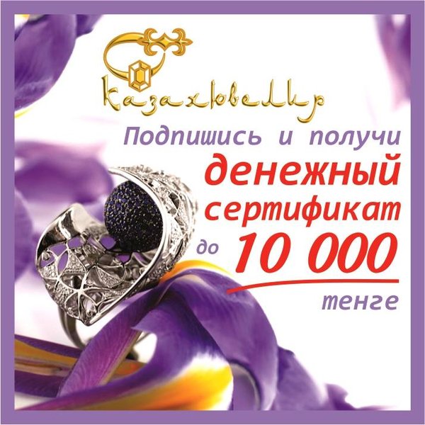 щика или выслать личным сообщением модератору группы. На этот адрес будет выслан единый сертификат на следующие номиналы: 2 000 тенге при покупке от 20 000 тенге; 5 000 тенге при покупке от 50 000 тенге; 10 000 тенге при покупке от 100 000 тенге. Главный приз: серебряное украшение Конкурс продлится до 30 ноября 2015 года Победитель будет определен путем случайного выбора. Удачи всем!