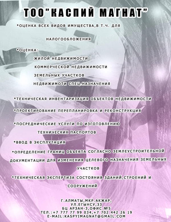 Оценочная компания ТОО «КАСПИЙ МАГНАТ»: № 560750. Услуги в Алматы — Маркет