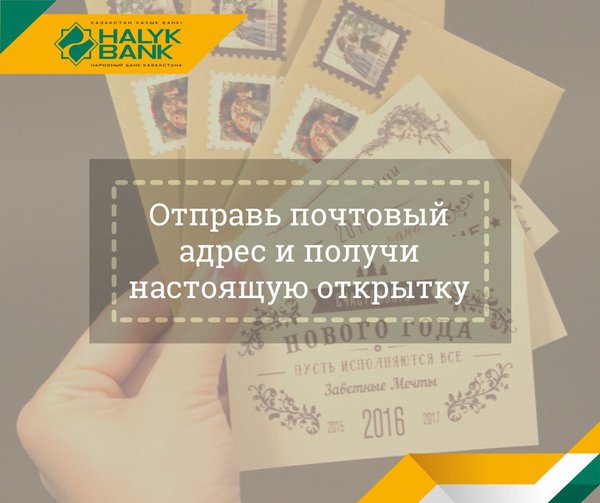 Halyk Bank (17.12.2015): Друзья, напоминаем, что у вас есть возможность получить новогоднюю «живую» открытку. И это совершенно бесплатно! :) Просто команда Halyk Bank желает быть ближе к вам в наступающем Новом году. Чтобы получить открытку от Halyk Bank, отправляйте свои почтовые адреса с указанием индекса и контактного номера телефона на наш e-mail: halyk.digital@gmail.com Адреса мы принимаем до 21 декабря включительно. А потом начнем рассылку :) Обещаем, что никому и ни за что не выдадим ваши контакты! Дед Мороз — исключение :) Всем добра!