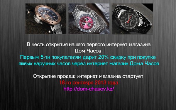 Внимание!!! В честь открытия интернет магазина Дом Часов! Первым 5-ти покупателям дарим 20% скидку при покупке любых наручных часов через интернет магазин Дома Часов! Открытие продаж стартует 18-го сентября 2013 года на Спешите приобрести стильные и качественные оригинальные часы Дома Часов