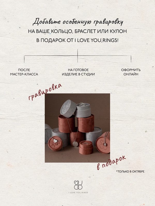 Найти классный подарок в последний момент? Легко! Сертификат I LOVE YOU, RINGS! — то, что вам нужно Получатель такого подарка сможет как создать ювелирное изделие (кольцо, подвеску, браслет, серьги) своими руками на мастер-классе, так и заказать украшение онлайн. Дарите близким впечатления и памятные украшения