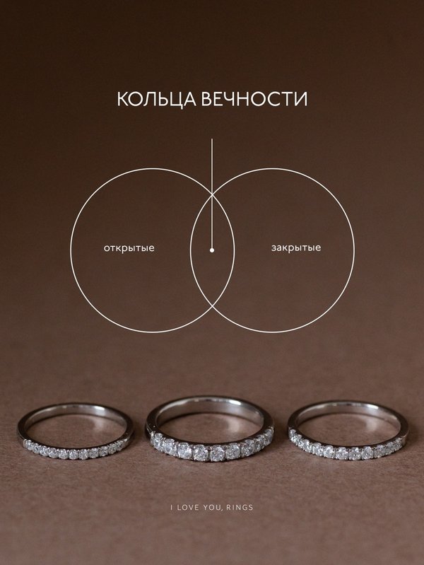 Закажите кольцо вечности в студиях I LOVE YOU, RINGS по вашим индивидуальным параметрам и предпочтениям • бесцветные природные бриллианты чистоты VVS1-VS2 и цвета F/G или 3/4. • лабораторные бриллианты качества 2/5 — полный аналог природного камня с идентичными характеристиками, но выращенный в лаборатории. • а также муассариты — синтетический минерал, отличается более ярким «радужным» блеском. Посмотреть каталог колец можно на сайте iloveyourings.ru