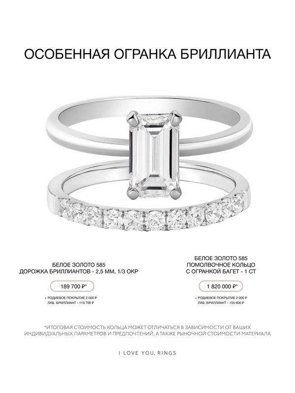Создадим обручальные комплекты с дорожкой бриллиантов по вашим предпочтениям и бюджету ️ Приглашаем вас на бесплатную примерку в студиях I LOVE YOU, RINGS! — вы сможете подобрать подходящий вариант из более 200 вариантов дизайна, а также удобную посадку и размер кольца. Бронируйте удобное время заранее Наши студии: Москва — ул. Фридриха Энгельса, 46с6 Санкт-Петербург — пер. Пирогова, 18 «Особняк Пальма» Новосибирск — ул. М. Горького, 54 Алматы — ул. Жамбыла, 155 Нью Йорк — 325 W 38th St, New York, NY