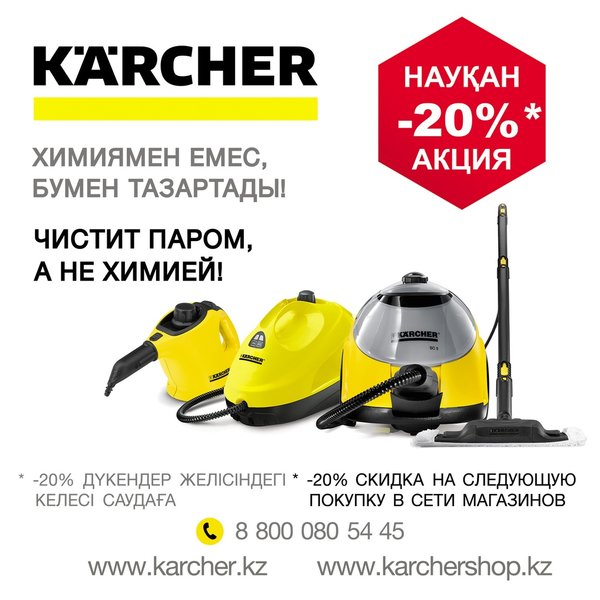 ноября 2018 года. При покупке любого пароочистителя серии SC, вы получаете купон на следующую покупку со скидкой 20%. *Перед покупкой уточните актуальную цену у нашего менеджера. Спрашивайте в официальных точках продаж или на сайте Karchershop.kz