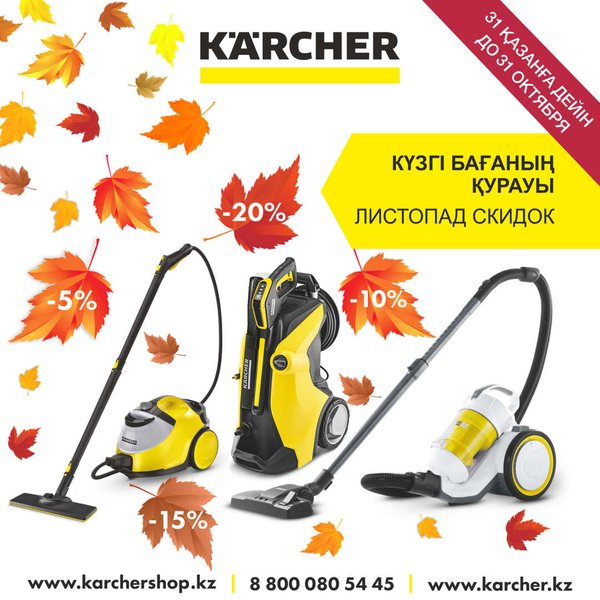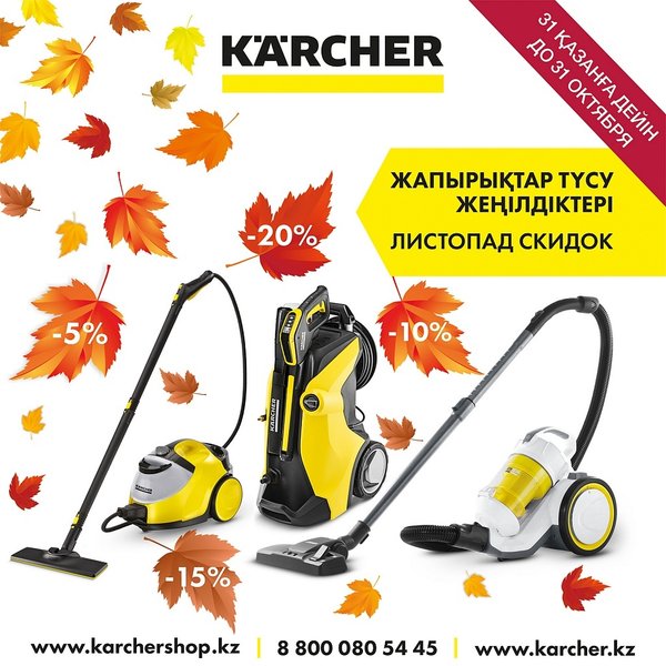 Листья падают как цены в Керхер! Объявляем осенний листопад скидок! Покупай любую бытовую технику и получай скидку на общий чек до 20%. Только до 31 октября. Подробности на сайте