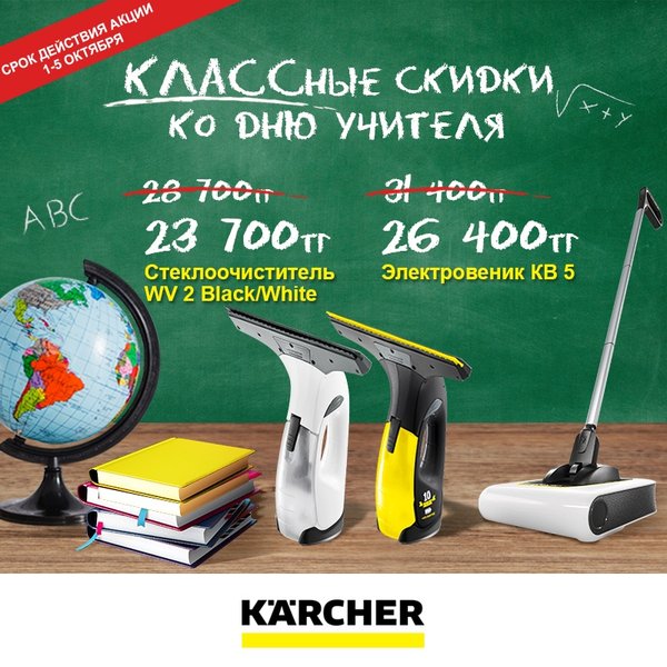 Впереди день учителя. Почему бы не подарить любимому педагогу полезный подарок, который поможет быстро справиться с домашними хлопотами и освободит время для отдыха? Цветы — это банально, а надежный помощник, который с удовольствием выполняет домашнюю работу, – совсем другое дело! КЛАССная акция ко дню учителя от Керхер - электровеники и стеклоочистители по специальной цене! Только с 1 по 5 октября в интернет магазине *Акция не суммируются с другими специальными предложениями