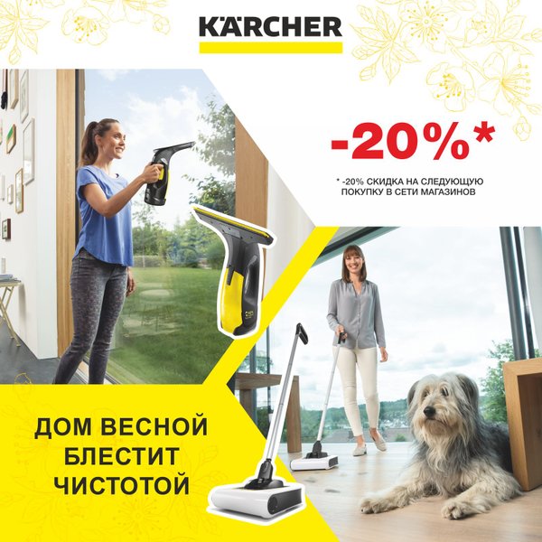 Пусть дом весной блестит чистотой! Только до конца марта весеннее предложение от Керхер! При покупке стеклоочистителя или электровеника, вы получаете 20% скидку на следующую покупку. Вы можете приобрести со скидкой бытовую технику, расходные материалы и химию. Количество товара не ограничено. Акция действует в интернет-магазине, во всех Керхер Центрах, а также у официальных партнеров.