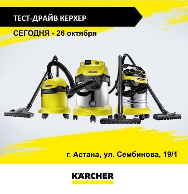 Мы обьявляем тест-драйв техники Керхер в строительном гипермаркете «Мегастрой» Только 2 дня — 30 и 31 августа вас будут ждать наши менеджеры, которые не только ответят на все вопросы, и помогут протестировать понравившуюся модель, но и подарят фирменные подарки. К тому же, только эти 2 дня техника Керхер в гипермаркете «Мегастрой» будет продаваться по специальной цене! Ждем вас по адресу г. Астана, ул. Сембинова, 19/1. 30 и 30 августа с 12.00 до 14.00 Приходите! Ждем вас! драйв