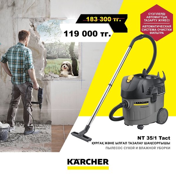 Профессиональный подход к чистоте с техникой Керхер. Лучшие цены на аппарат высокого давления HD 10/25—4S и пылесос влажной и сухой уборки NT 65/2 Tact. Предложение ограничено. ______________________________________________________________________ Kärcher tehnıkasymen tazalyqqa kásibı tásil. HD 10/25—4S joǵary qysymdy aparatqa jáne NT 65/2 Tact ylǵaldy jáne qurǵaq tazalaýdyń shańsorǵyshqa úzdik baǵalar. Usynys shekteýli.