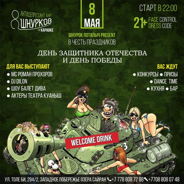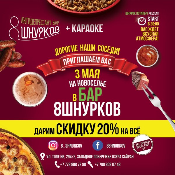 Антидепрессант бар 8 ШНУРКОВ + КАРАОКЕ готовит для вас бешеную шоу программу на новоселье. 3 мая, в пятницу ждём у себя в гостях. Будет о..уительно Мы открыты каждый день с 16:00; Толе би, 294/2