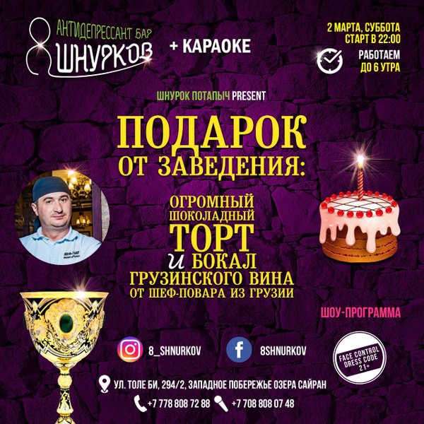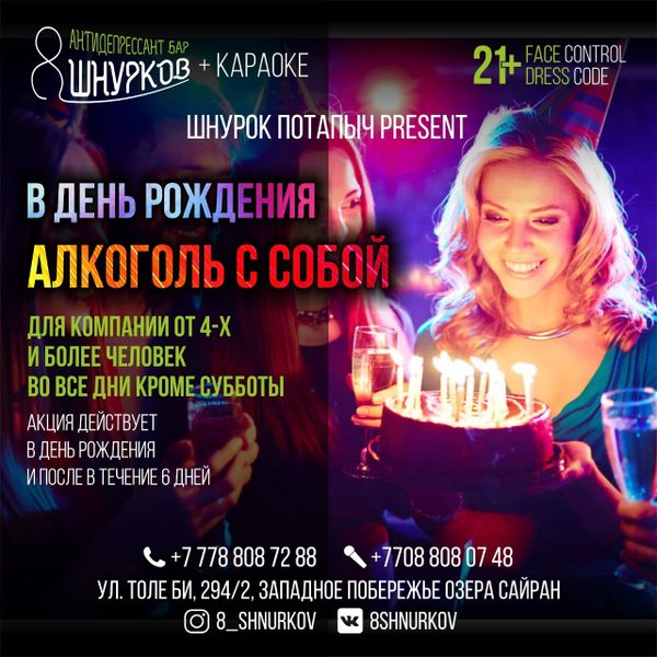 Друзья, бар 8 ШНУРКОВ предлагает вам отличную акцию. В честь вашего дня рождения мы разрешаем вам принести с собой алкоголь. Акция действует на компанию от 4-ёх и более человек. А так же, акция действует с воскресенья по пятницу (включительно), кроме субботы. Данной акцией вы можете воспользоваться в день рождения и после дня рождения в течение 6 дней. Мы открыты каждый день с 12:00; Толе би, 294/2