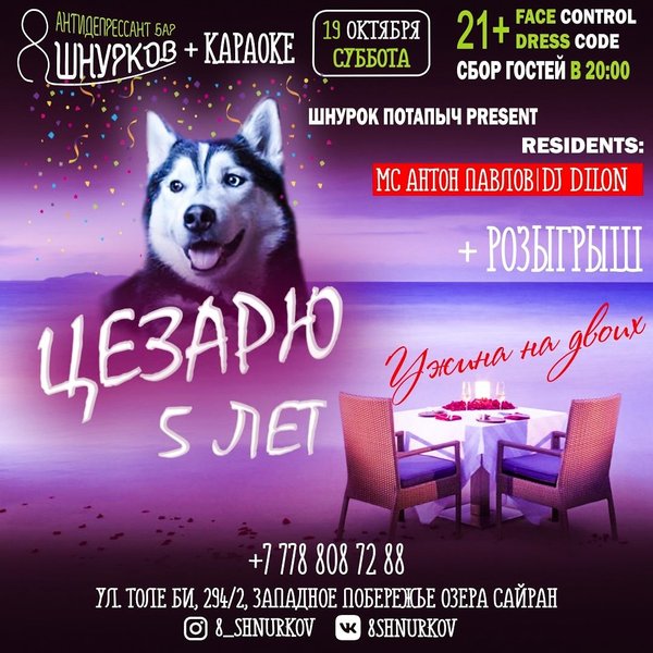 Дорогие наши гости! 19 ноября, в субботу, мы будем праздновать день рождения Цезаря. Цезарю исполняется 5 лет. Очень будем рады, если в этот день вы будете вместе с нами Обязательно заранее звоните и бронируйте столики. Мы открыты каждый день с 16:00; Толе би, 294/2