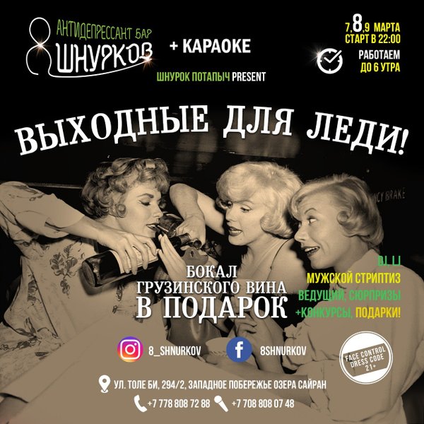 Дорогие дамы, бар 8 ШНУРКОВ приглашает всех на праздничные дни к себе в гости. Будет круто Мы открыты каждый день с 16:00; Толе би, 294/2