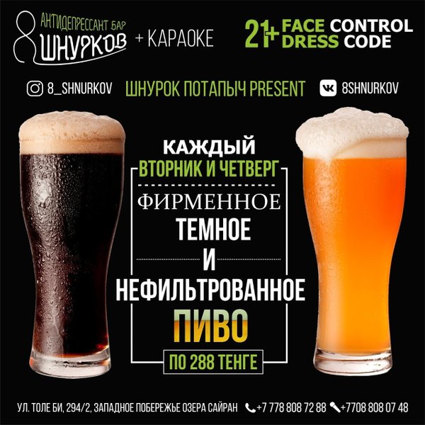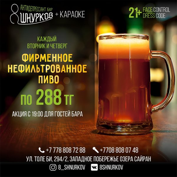Ждём любителей тёмного и нефильтрованного ПИВА в баре 8 ШНУРКОВ каждый вторник и четверг Теперь каждый вторник и четверг фирменное тёмное ПИВО и фирменное нефильтрованное ПИВО по 288 тенге. Мы открыты каждый день с 16:00; Толе би, 294/2