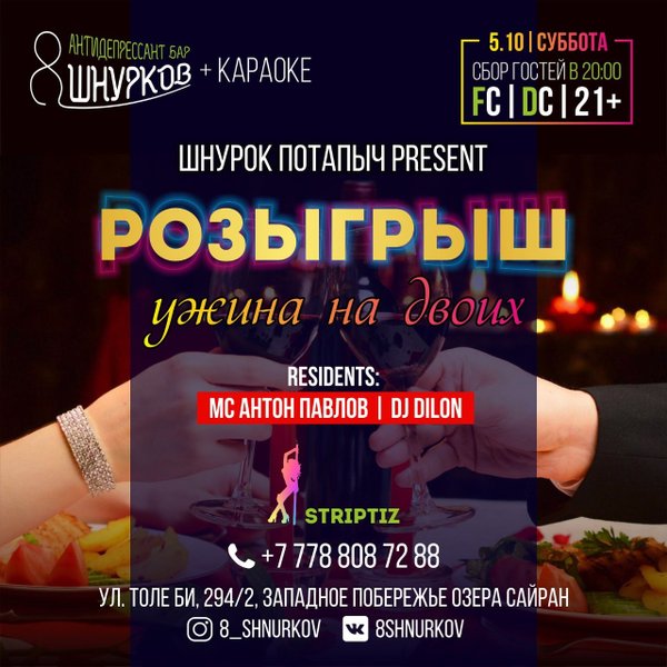 Дорогие наши гости, ждём вас в эту пятницу и субботу в баре 8 ШНУРКОВ. ПЯТНИЦА: Mc Антон Павлов, Dj Pavlov, шикарный стриптиз от красотки Лило СУББОТА: Mc Антон Павлов, Dj Dilon, шикарный стриптиз от красотки Лило Работаем до 6 утра Мы открыты каждый день с 16:00; Толе би, 294/2