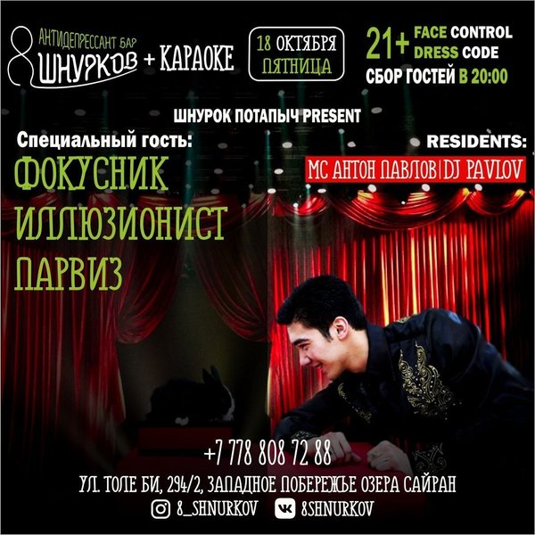 Фокусник-иллюзионист Парвиз в баре 8 ШНУРКОВ Мы открыты каждый день с 16:00; Толе би, 294/2