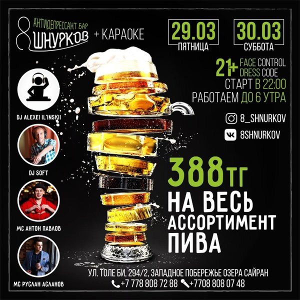 Дорогие наши, в пятницу и субботу мы ждём вас в баре 8 ШНУРКОВ. В пятницу и субботу весь ассортимент пива по 388 тенге. Пятница, 29 марта: Dj Alexei Il'inskii Mc Руслан Асланов Суббота, 30 марта: Dj Soft Mc Антон Павлов Работаем до 6 утра Мы открыты каждый день с 16:00; Толе би, 294/2