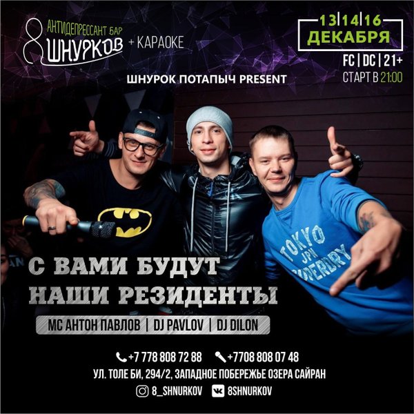 Дорогие друзья, Mc Pavlov и Dj Pavlov ждут вас в баре 8 ШНУРКОВ Работаем сегодня до 6 утра. Мы открыты каждый день с 16:00; Толе би, 294/2