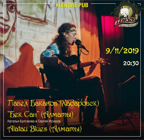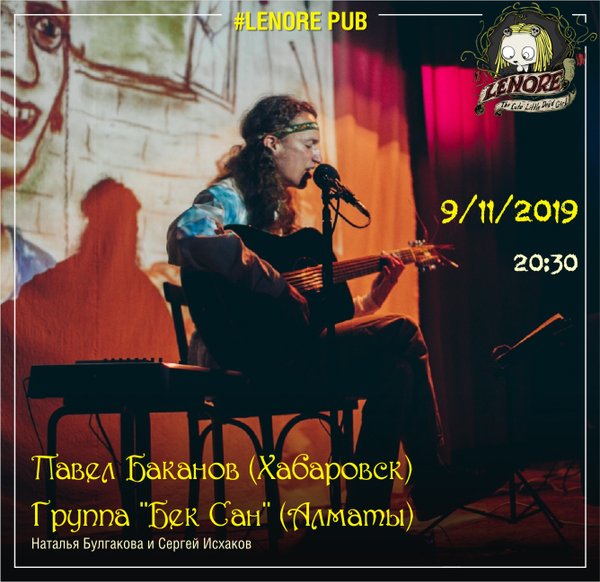 Вы готовы к музыкальным открытиям? В ноябре мы будем удивлять! 9 ноября в Lenore pub гость из Хабаровска — Павел Баканов. Приглашаем тебя окунуться в атмосферу народного фольклора и авторских композиций автора. Павел Баканов — автор песен, лауреат дальневосточных фестивалей, путешественник, блогер, писатель, режиссер. жанр — фьюжн-акустика Также в этот вечер вас порадует своим выступлением: -группа «Бек Сан» (Наталья Булгакова и Сергей Исхаков); -и группа Alatau Blues Начало: 20:30 Вход: СВОБОДНЫЙ Мы приглашаем всех любителей музыки. Это буде… — Читать дальше