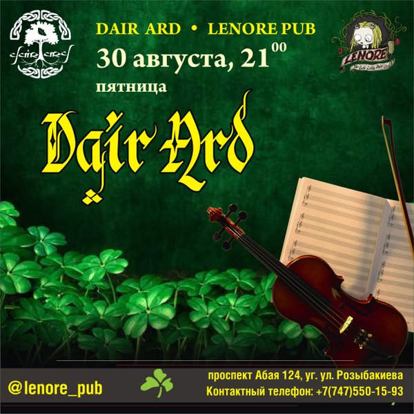 Провожаем лето в компании любимых музыкантов под озорные кельтские мотивы! 30 августа Dair Ard в @lenore_pub Начало в 21:00 Вход свободный! дымные кальяны сочные шашлыки и стейки холодное пиво домашнее вино Мы находимся по адресу: пр.Абая, 124 уг.Розыбакиева Бронь столов: