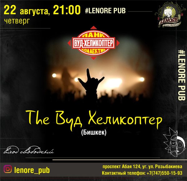 Музыканты из Бишкека знакомы Алматинской публике по бешеной энергетике, которую они раздают со сцены 22 августа, в четверг в @lenore_pub выступит группа из Бишкека — The Вуд-Хеликоптер @woodhelikopter Жанр: Панк с элементами ska и советской эстрады. Обещаем атмосферное настроение и много качественной музыки! Быть всем, тем более — вход СВОБОДНЫЙ начало: 21:00 Ждем вас: пр.Абая, 124 уг.Розыбакиева