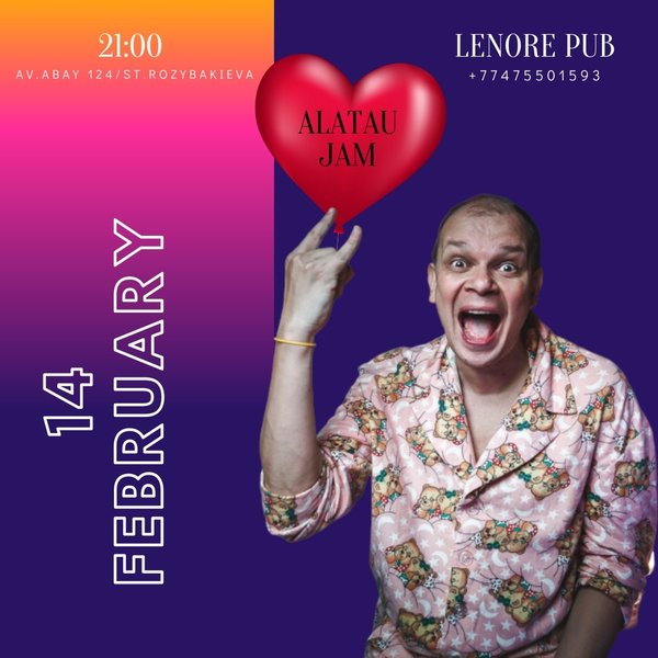 Даже если ты поклонник самой тяжелой музыки, уверены — чувство любви тебе не чуждо! А посему предлагаем на миг разбавить серые будни красными сердечками! ДЕНЬ ВЛЮБЛЕННЫХ в LENORE pub. 14 февраля на нашей сцене Алатау Джем Будем сотрясать стены под самые романтичные и драйвовые песни! Ждем гостей в 21:00 Вход свободный. Купидон с ирокезом будет ждать тебя по адресу: пр. Абая, 124 угол Розыбакиева бронируй