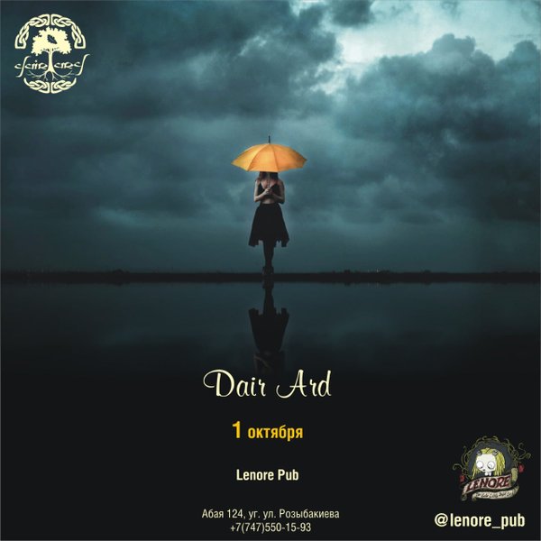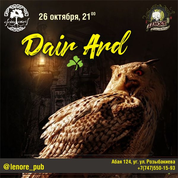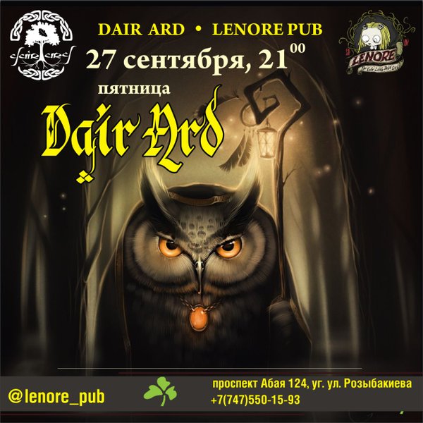 Dair Ard (01.04.2023): Dair Ard в баре Lenore Приветствуем, друзья! Давненько мы не испытывали на прочность каменный пол Lenore pub Самое время исправлять! До следующей пятницы как раз есть время выучить парочку танцевальных движений Дата: пятница, 7 апреля Где: Lenore pub Адрес: пр. Абая 124 ⌚Начало: 21.00 ️Вход 2000тг. ️Телефон для справок и брони:
