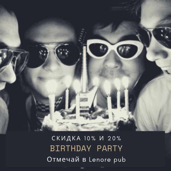Отмечай день рождения в LENORE PUB и получай подарки, дабы тусовка прошла не только весело и пьяно, но еще и выгодно! Каждый именинник получает от нас скидочную карту, которой может воспользоваться сразу же! Маленький ништячок дает тебе право: скидку 10% на бар скидку 20% кухню В общем, расклад понятен! Звони, бронируй и отмечай свой день рождения вместе с нами! P.S. Не забудь взять с собой друзей и отличное настроение! Ждем твое тело и душу по адресу: пр.Абая, 124 угол Розыбакиева Звони и бронируй: