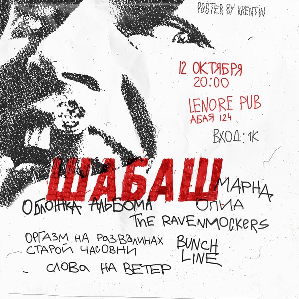 Дождались епта! Шабаш 4! Уже в эту е***ную субботу, 12 октября разнесем танцпол своим слэмом под жаркий панк рок! С нами в этот вечер будут: Опиа Обложка альбома Марна Слова на ветер Ravenmockers Bunch line В этот вечер вас ждёт наш welcome drink всем полюбившийся за долгое время! Также будет продаваться мерч «Шабаш» А также премьера фильма от Restless sb «Хаус для Панков» Всем быть в 19:00. Вход на премьеру фильма: 0.00 KZT Вход на шабаш: 1000 KZT Розыгрыш призов от организации Шабаша! Приходи трясти костями! пр.Абая, 124 уг.Розыбакиева