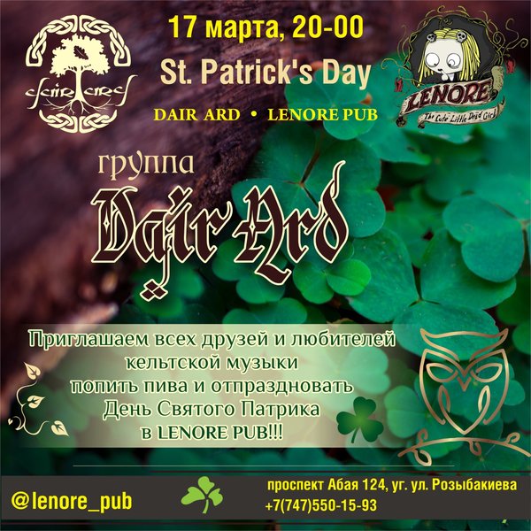 17 марта приглашаем всех отметить День Святого Патрика вместе с Lenore pub и нереальными колоритными и нашими любимыми Dair Ard! В этот вечер вы сможете отдохнуть от работы и послушать старые кельтские мелодии и песни! И конечно же, потанцевать от души! Начало в 20:00 Вход — СВОБОДНЫЙ пр.Абая, 124 уг.Розыбакиева