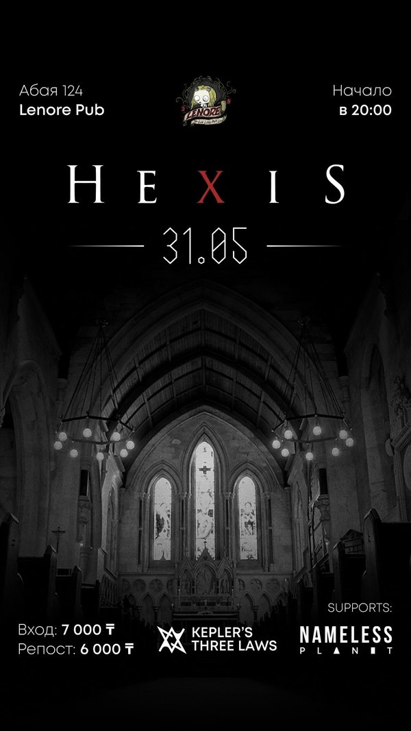 Hexis — Датская blackened sludge группа из Копенгагена, основанная в начале 2010 года. По словам парней, они черпают вдохновение у таких коллективов, как Celeste, Shora, Altar of Plagues Kepler’s Three Laws — пост хардкор, металкор бэнд с меланхоличными соло партиями! Это мясо подается в ultra well done с холодным соусом пост рока Nameless Planet — Прогрессив металкор бэнд, смешивающий агрессивные риффы и эмоциональные мелодии 31-го Мая!