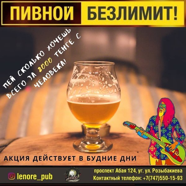 Как ваше осеннее настроение? Хондрите или всё путём? Нам то точно все равно — ибо атмосфера Lenore pub не зависит от погоды и всегда на высоте! Сегодня у нас выходной, ну а завтра мы по традиции ждем вас, чтобы скрасить серые будни! Пивной безлимит по прежнему актуален для наших гостей! Платишь 2000 тенге и пьешь, сколько хочешь! А 28 числа вас ждет супер крутой концерт от музыкантов из Караганды, Алматы и Бишкека! Самое время купить билеты! Раздадим жару в конце сентября! Приходи трясти костями! пр.Абая, 124 уг.Розыбакиева