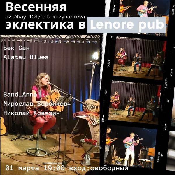 Весенняя эклектика в Lenore pub! 1 марта встречаем весну вместе с нами! Мы приготовили для вас вечер крутой разноплановой музыки! Уже сейчас можно бронировать столики — ведь пропустить такое точно нельзя! На сцене: Бек Сан Alatau Blues Band_Anna Мирослав Воронков Николай Ковязин Для гостей: ароматный дымный кальян бар, домашнее вино стейки, закуски, шашлык Все это по очень демократичным ценам. Ждем всех: пр. Абая, 124 угол Розыбакиева бронируй