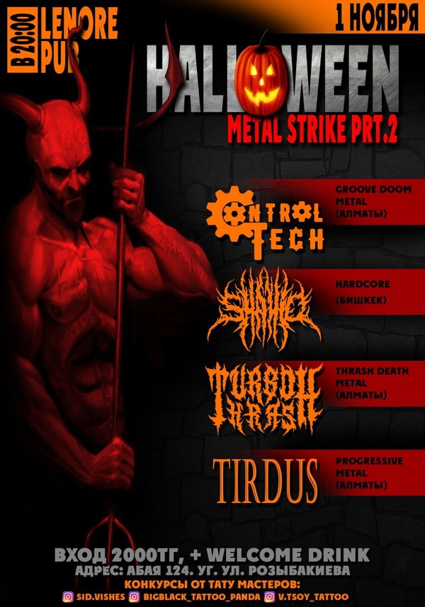 Вечер тяжелой музыки в честь славного праздника Halloween! Играют: ControlTech — GrooveDoom (Алматы) Shahid — HardCore (Бишкек) Turbothrash — ThrashDeath (Алматы) Tirdus — Progressive (Алматы) А также: Конкурсы от тату мастеров и от организаторов. Вход в день концерта — 2000тг Цена билета 1500тг, в день гига 2000тг БИЛЕТЫ: Lenore Pub: Магазин Кобзон У организатора 1 ноября в 20:00 Приходи трясти костями! пр.Абая, 124 уг.Розыбакиева