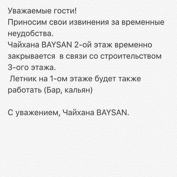 Чайхана и Автомойка «BAYSAN» предлагает — комплексные обеды по 1200 тенге каждые будние дни. — кальян — восточная, казахская, европейская музыка — удобные диваны — вкусные блюда восточной и европейской кухни -также АВТОМОЙКА Вашего АВТО! Приходите! Обслужим Вас с позитивом! Работаем с 11:00 до 00:00 каждый день! Наш адрес: г.Алматы, ул.Тургут Озала, 249А Тел.: