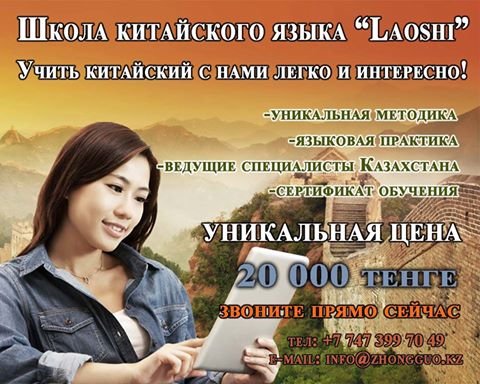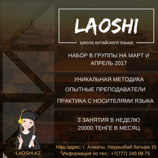 Друзья, в нашей школе китайского языка «Лаоши» открыт набор на март и апрель! Творческая атмосфера, профессиональные педагоги, носители языка и современные учебные материалы ждут вас по адресу г.Алматы, ул Наурызбай-батыра 15 (уг. ул. М.Маметовой).
