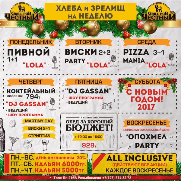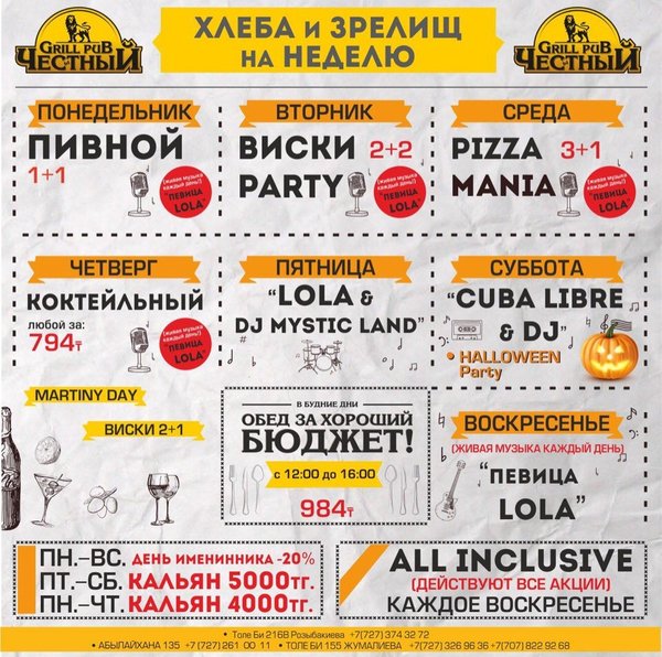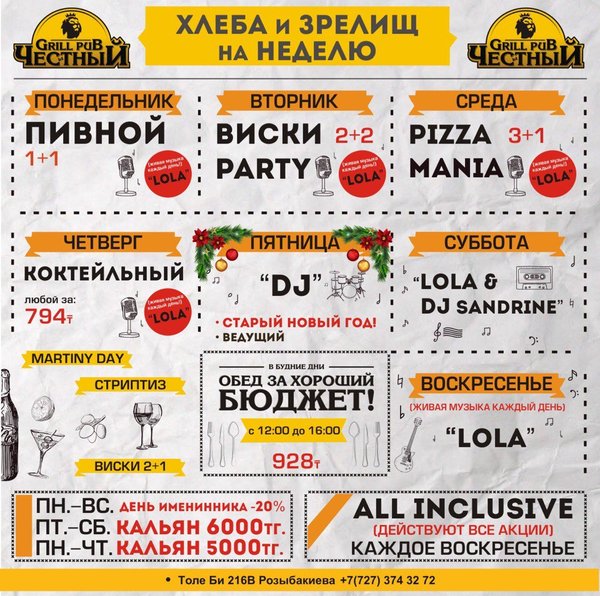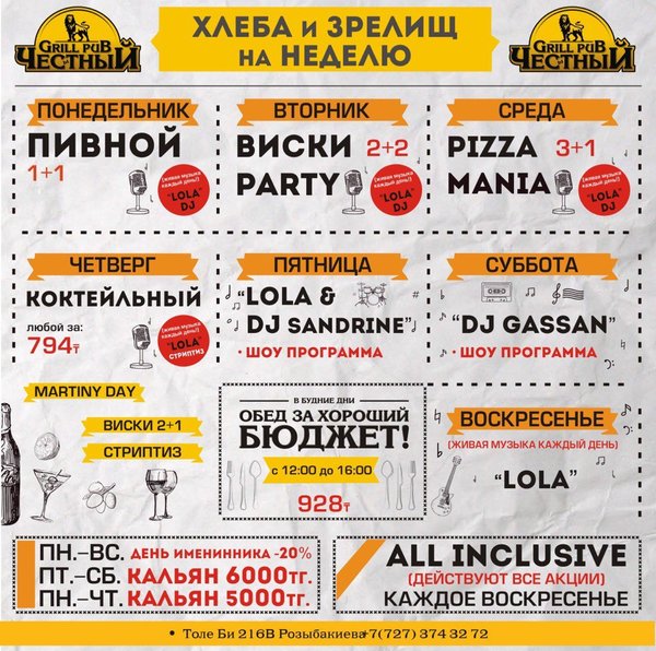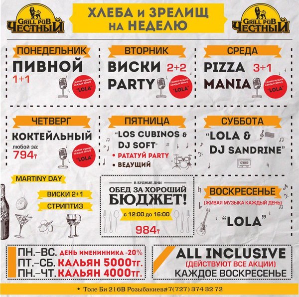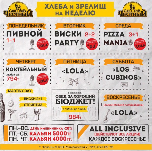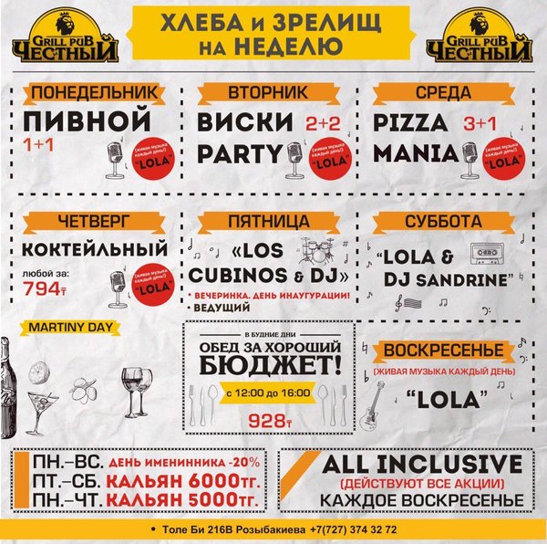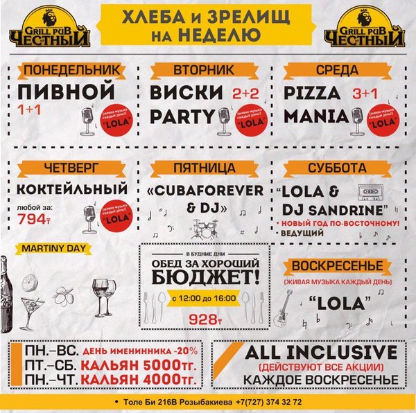 Добрый день, друзья! Желаем Вам вкусной и сытной недели вместе с Честным! Приятная музыка, уютная атмосфера и вкусная еда, что еще нужно для того что бы собраться в хорошей компании и поболтать по душам, а может быть и порешать важные дела, решать вам! В ЧЕСТНОМ обед за хороший бюджет 326 96 36 / WhatsApp ул.им.Толе би 155 А, уг.ул.Жумалиева БЦ » GRAND ASIA » 261 00 11 ул.Абылай Хана 135, уг.ул.Шевченко 374 32 72 ул.им.Толе би 216 B, уг.ул. Розыбакиева topche.info@gmail.com YouTube : Территория Объединенных Пабов